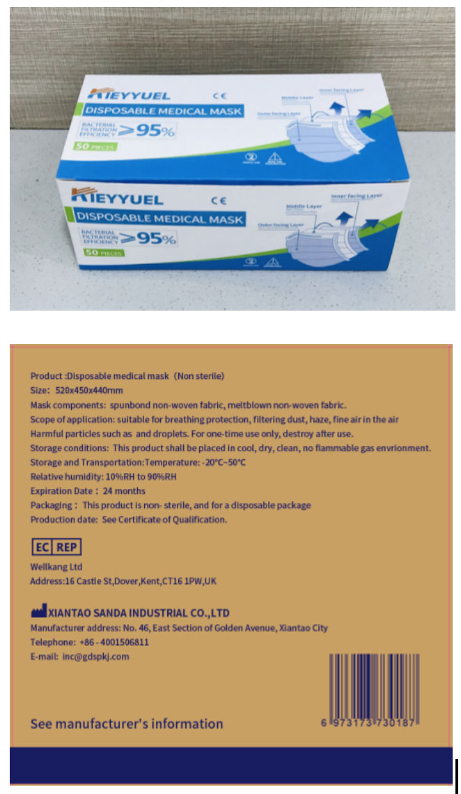 Engångsmedicinsk mask, it is composed of two layers of fiber nonwoven fabric for medical and health care, with one layer added in the middle more than 99% of thefilter melt blown cloth is welded by ultrasonic wave.