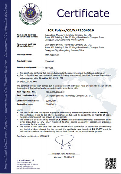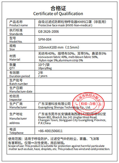 N95 skyddande mask (vikbar)-Certificate of Qualification
